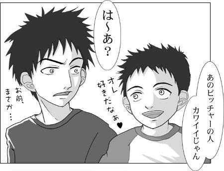 水谷の側には栄口って思い込んでたから、コレは結構ショックでした。二人で仲良くケーキ食べてたのになぁ〜。あの頃が懐かしい。フミキのバカ〜!(涙)