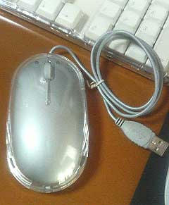 このマウス、ちょっと反応が鈍い。クリックの感触がフニャっとしてて気色悪い。しかも光学式マウスのくせにAppleプロマウス用のシリコンゴム製の上等なマウスパッドの上で反応しやがらない。仕方ないので机の上で直マウスですよ。やれやれ。