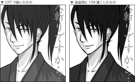 なので、CRTで描いたものを10%ほど濃くしてみたら液晶ではちょうどイイ感じになるんじゃないでしょうか。